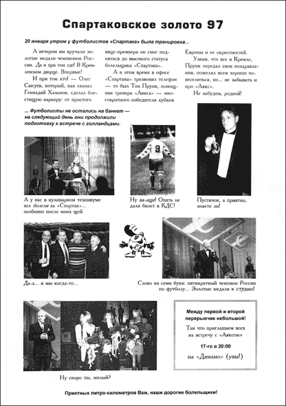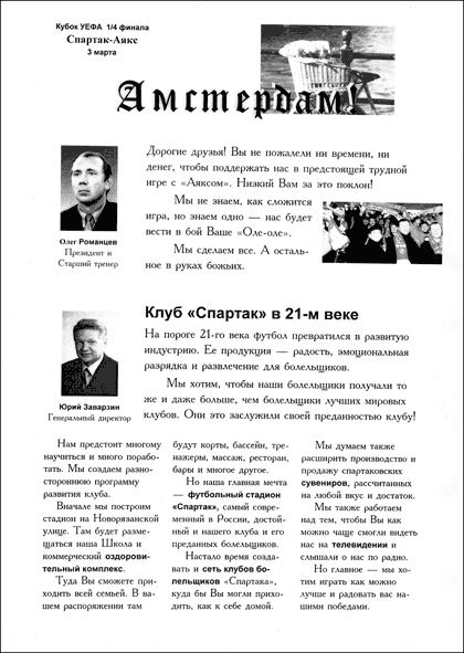 Листовки могут быть не только рекламными. Мне приходилось создавать и чисто PR-ные листовки. Особо запомнилась листовка для болельщиков футбольного клуба «Спартак» (Москва), которую я сделал перед матчем с «Аяксом» – в самолёте у меня просили дополнительные экземпляры этой листовки не очень твёрдо стоящие на ногах фаны, которые, похоже, несколько буквально восприняли моё пожелание «Приятных литро-километров Вам, наши дорогие болельщики!»