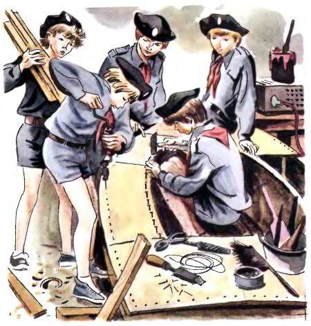А занимались мы как раз ремонтом наших парусников — делом шумным, пыльным, но необходимым. Стук, гром, дым от горячей олифы. Кто-то борта шпаклюет, кто-то гвозди вбивает, кто-то дрелью жужжит, кто-то кистью машет. И лишь один человек стоит неподвижно: часовой у поднятого на мачту отрядного флага.