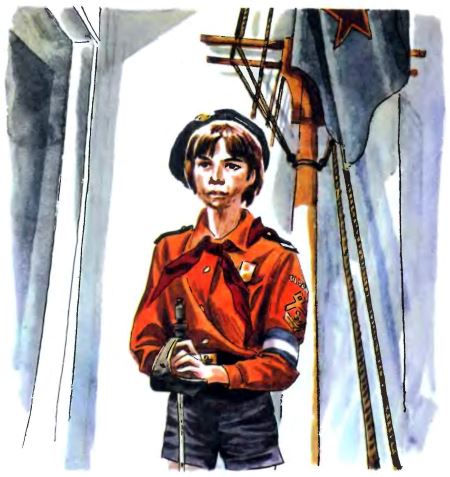 …Пионерский горн — красивая и очень нужная вещь. Конечно, не всегда его используют как надо. Случается, что идёт по тротуару нестройной толпой отряд, а горнист хрипло тутукает. Это зря. Сигнальная труба — не оркестровый инструмент, марш на ней как следует не сыграешь. Зато как здорово в пионерском лагере вскакивать с кроватей, когда ваш ловкий и умелый горнист на крыльце играет весёлый сигнал «подъём»! И звёздочки солнца разлетаются с его горна.