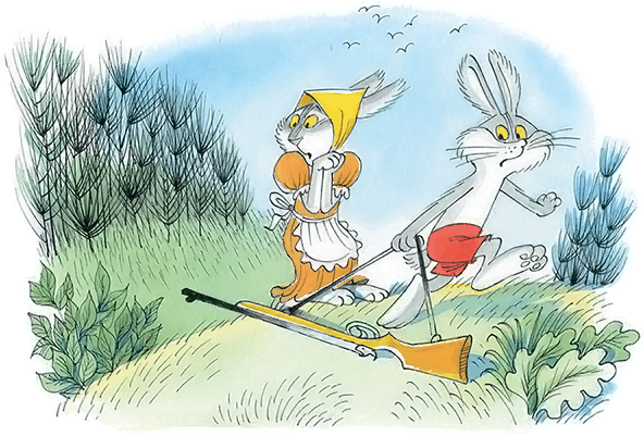 ЗАЙЧИХА. Что ты, косой! В своём ли ты уме? Едва от Лисы спасся, а теперь сам под ружьё лезешь?