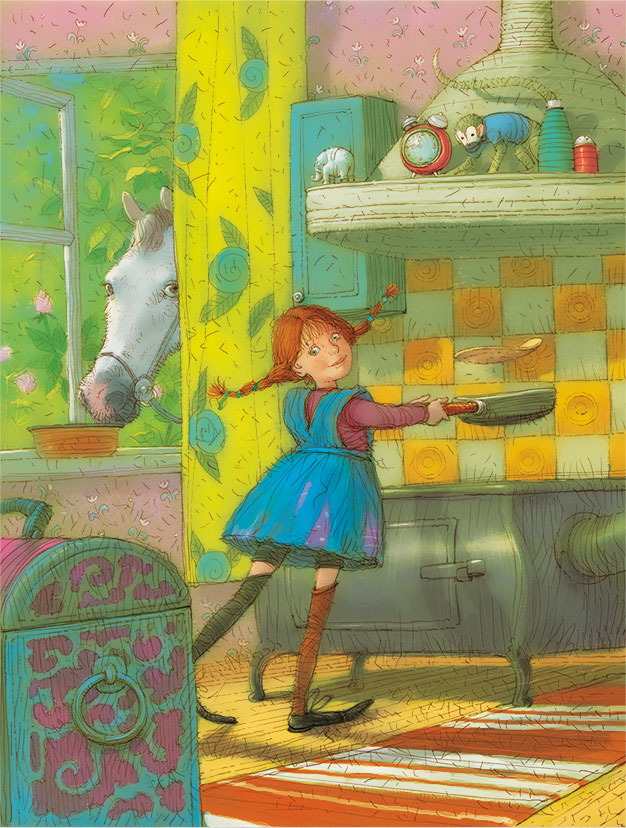 Пеппи говорила и одновременно выбирала из кастрюльки попавшую туда яичную скорлупу. Затем она сняла висевшую на гвозде щётку на длинной ручке и принялась взбивать ею тесто так усердно, что забрызгала все стены. То, что осталось в кастрюльке, она вылила на сковороду, которая давно стояла на огне. Блин тут же подрумянился с одной стороны, и она подбросила его на сковороде, да так ловко, что он, перевернувшись в воздухе, шлёпнулся обратно вниз неподжаренной стороной. Когда блин спёкся, Пеппи метнула его через всю кухню прямо на тарелку, стоявшую на столе.