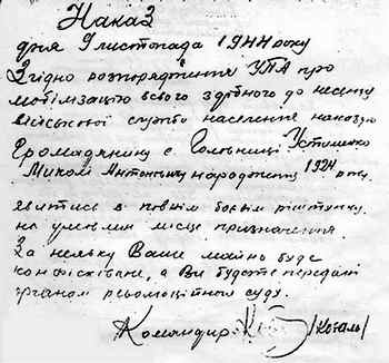 1. Приказ командования УПА о мобилизации гр-на Устименко Н. А. в УПА, содержащий предупреждение, в случае неявки на пункт назначения, конфискация принадлежащего ему имуществу и отдачи под суд.
