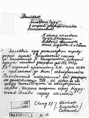 2. Решение полевого суда ОУН-УПА по делу казака Ризиканта, обвиняемого в дезертирстве и измене родине. Приговор: наказать казака Ризиканта самым суровым образом — путем отрубания головы перед отрядом.