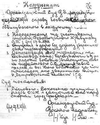 9. Постановление полевого суда группы УПА «Заграва» от 03.05.1944 г. по делу казаков Вовкулака и Шаткир. За сон на посту оба приговорены к расстрелу. Приговор утвердил командир Ярок.