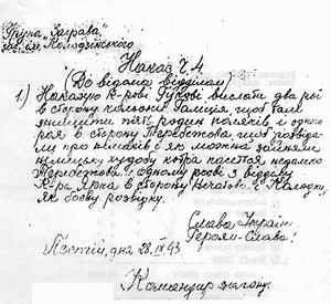 7. Приказ № 4 командира отряда группы «Заграва» главарю банды Гуку о направлении двух отделений (роев) в польскую колонию «Галіція» с целью уничтожить там пять семей поляков и произвести разведку.