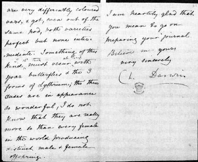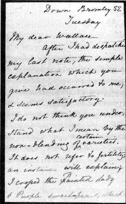 ... Думаю, Вы не поняли, что я имею в виду под неслиянием определенных разновидностей. Речь идет не о плодовитости; это будет ясно из примера. Я скрестил сорта душистого горошка Пейнтед леди и Перпл, которые окрашены совсем по-разному, и получил, даже из одного и того же боба, оба сорта в наилучшем виде, но никаких промежуточных разновидностей. Что-то в этом роде, надо полагать, должно происходить, по крайней мере, с Вашими бабочками и теми тремя формами дербенника; хотя эти случаи на вид так удивительны, не знаю, удивительнее ли они на самом деле, чем то, что всякая женская особь на свете производит отчетливо различное мужское и женское потомство...