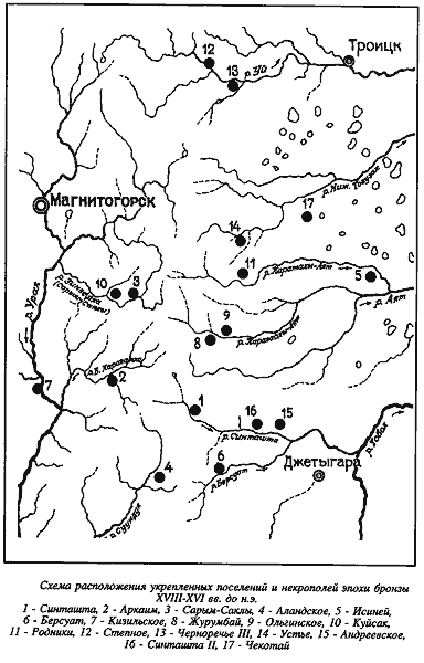 Пишут так: «Время существования петровско-синташтинских комплексов определяется по характерному набору металлических изделий и костяным пластинчатым псалиям, известным по находкам в IV шахтной гробнице Микен XVII–XVI вв. до н. э. Оно соответствует Трое VI, концу среднеэлладского и раннемикенскому периодам материковой Греции» [1а], с. 35.