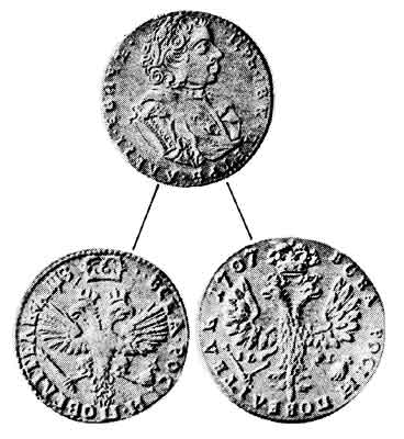 8) ЗОЛОТЫЕ ЧЕРВОНЦЫ 1716 ГОДА С ПРОФИЛЕМ ПЕТРА I, ДВУГЛАВЫМ ОРЛОМ И ЛАТИНСКОЙ НАДПИСЬЮ: «Божьей милостью России повелитель, великий князь московский», рис. 105. Ценность на этих червонцах не обозначалась, но «по монетной стопе и пробе сплава русские червонцы полностью соответствовали широко использовавшимся в международной торговле нидерландским дукатам» [31], с. 370. Для каких целей правительство Петра I чеканило эти червонцы — неизвестно [31], с. 370. В монографии В.В. Узденикова они «предположительно отнесены к монетам для заграничных платежей» [31], с. 370. Может быть, Петр предназначал их для стран Западной Европы, которые он собирался в будущем завоевать и присоединить к России.