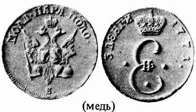 Рис. 106. Русская монета для Молдавии и Валахии, отчеканенная в 1771 году во время войны с Турцией. В это время турецкие провинции Молдавия и Валахия были заняты русскими войсками. Имеет двойное обозначение ценности — в турецких «парах» и русских «деньгах», 1 пара — 3 деньги. Такие монеты чеканились в 1771–1774 годах на Сандогурском частном монетном дворе по заказу российского правительства [31], с. 377. В 1774 году был заключен Кючук-Кайнарджийский договор с Турцией, по которому Молдавия и Валахия тогда не отошли к России и остались в составе Турецкой империи [3], т. 28, с. 87. И в этом же году чеканку русских монет для Молдавии и Валахии прекратили [31], с. 377. Взято из [31], с. 380