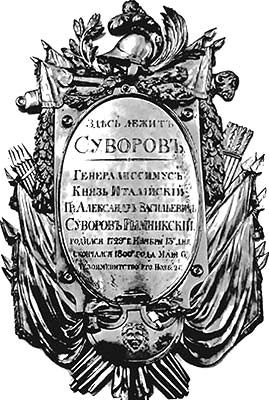 Рис. 144. Щит, висящий на стене возле могилы Суворова в Александро-Невской Лавре в Петербурге. Надпись гласит: «Здесь лежит Суворов, Генералиссимус, Князь Италийский, Гр[аф] Александр Васильевич Суворов-Рымникский…». Современная фотография