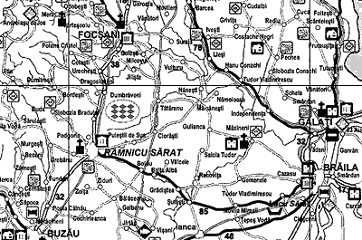 Рис. 147. Фрагмент современной дорожной карты Румынии. Примерно посередине между городами Фокшаны (FOCSANI) и Бузео (BUZAU) расположен город Рымнику-Сэрат (RAMNICU-SARAT), недалеко от которого в 1789 году произошла знаменитая «рымникская» битва. Место сражения отмечено нами на карте