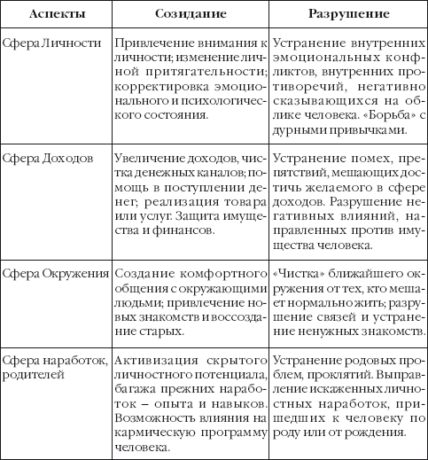 В таблице вы можете увидеть название сфер в человеке, на которые в состоянии оказать влияние руны в вопросах созидания или разрушения.