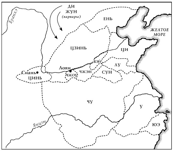 Когда началась эпоха Восточного Чжоу, четыре мощных государства – Инь, Ци, Чу, Цинь – окружали его земли. И еще пятое набирало силы, чтобы присоединиться к ним: Юэ на юго-востоке. Более поздняя история называет это время периодом Пяти Гегемонов – но на деле существовало еще четыре государства, которые включили в свои границы достаточно более мелких территорий, чтобы соревноваться с самыми могущественными. Это были Лу и У, оба простиравшиеся до моря, Чжэн, граничащее с землями Чжоу, и Сун к востоку от него.1