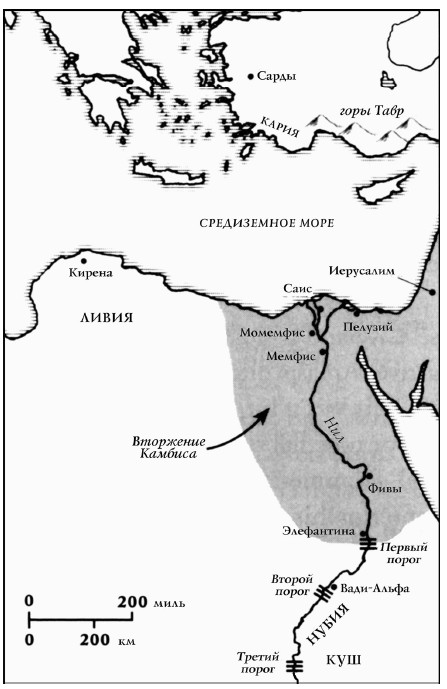 Через четыре года после коронации Камбис начал наступление на Египет. Его флот отправился вдоль берега, а армия пересекла пустыню. Камбис в сопровождении своего копьеносца Дария выступал в авангарде. Дарий, офицер его личной охраны, был сыном персидского вельможи, управлявшего завоеванной областью под названием Парфия в северо-восточной части империи.9