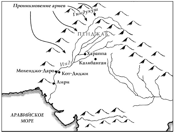 Однако они не сразу отправились завоевывать долину Инда, а прожили в Семиречье не менее века, прежде чем двинулись далее на юг и восток. Ко времени, когда они проложили путь вниз, к хараппанским городам, здешняя цивилизация уже погибла и исчезла. Вероятно, пришельцам еще могли противостоять живущие здесь разрозненные группы людей, но организованного сопротивления они не встретили. Переселяясь, они использовали сохранившиеся пустые дома, которые могли найти, так как своих домов не строили, а в их языке вообще отсутствовали слова для обозначения понятия «строительный раствор». Утонченную и высокоорганизованную хараппанскую цивилизацию сменила культура кочевых племен с более низкой технологией, без какого-либо опыта государственного управления, но зато способных куда лучше адаптироваться к незнакомому окружению.