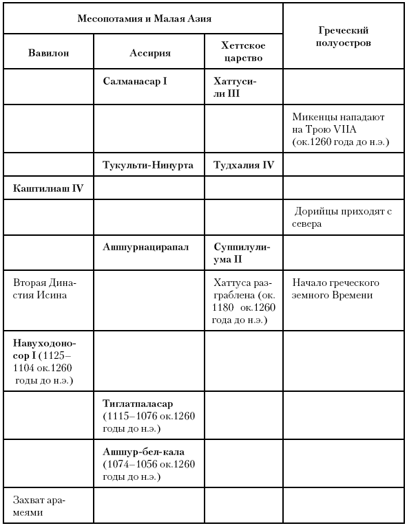 Арамеи, как и дорийцы, не имели письменности. И так же, как Египет впал в хаос переходного периода, а темнота разлилась по Греческому полуострову, мрак растекся со старых хеттских земель и накрыл Месопотамию. Земли между двумя реками вступили в свое темное время – и на сто лет или около того в этой мгле не проступают очертания истории.