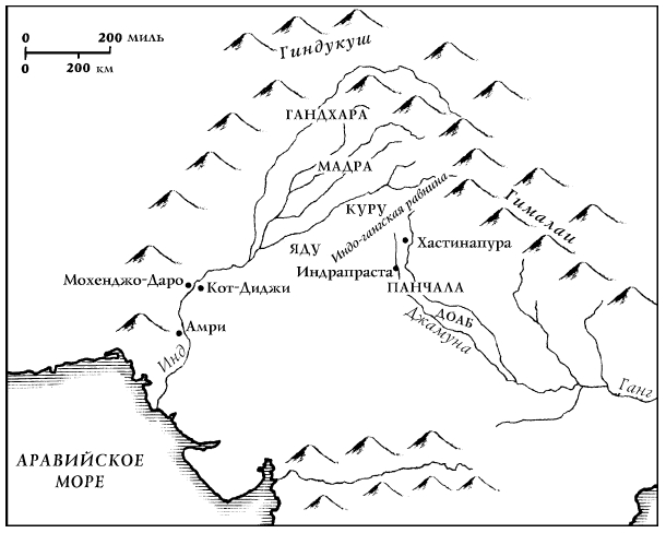 Хотя исторические подробности этой войны затерялись во времени, более поздние поэмы отразили ее в «Махабхарате» как эпическое событие – точно также, как Гомер обессмертил Троянскую войну, переслоив древнюю правду приметами и обычаями своего собственного времени.4 Согласно Махабхарате, война вспыхнула из-за очень сложного клубка генеалогических противоречий. [139] Царь клана Куру умер без потомства – это означало, что царская линия почти пресеклась. Остававшимися членами царской семьи были только царица-мать, две бездетные жены умершего царя и его старший брат Бхисма. От Бхисмы, однако, толку не было, так как несколько лет назад он дал торжественную страшную клятву оставить все претензии на трон брата, а также вторую торжественную клятву – сохранять целибат.