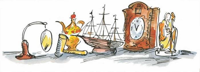 Здесь всё было очень необычным. В зале стояло много всевозможной мебели. Кресла, стулья и буфеты громоздились друг на друга. Под потолком висело множество люстр и ламп с большими, похожими на купола абажурами. В одном конце зала стояли столы, заставленные подсвечниками, кухонными весами, кастрюлями, формами для пирожных и электрическими плитками. А кроме того, в зале было много-много людей. На высокой кафедре стоял мужчина с кофейной мельницей в руке и кричал:
