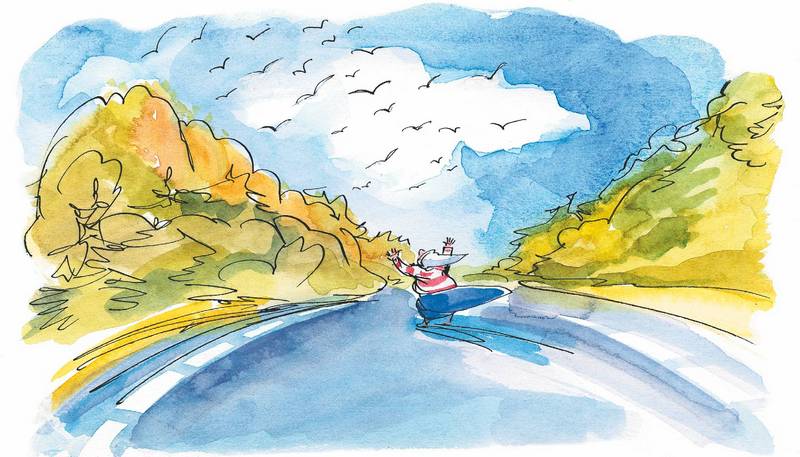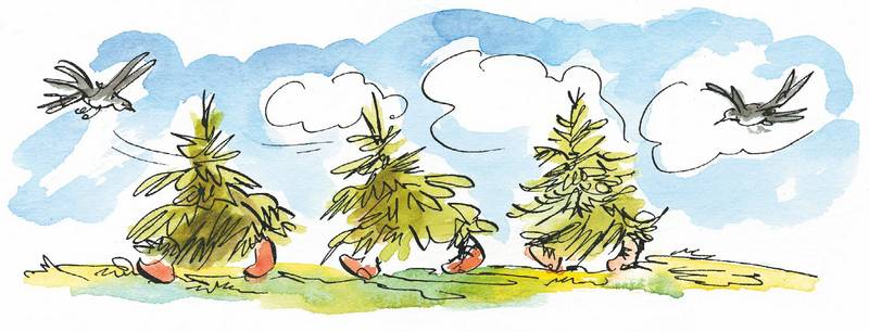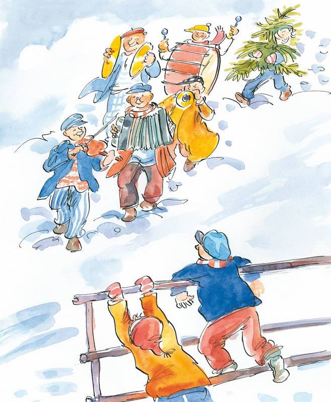 На лесной дороге замелькали блестящие медные трубы; их несли большие сильные люди. У всех за спинами висели рюкзаки, а самый последний нёс в руках маленькую ёлочку. Стройной колонной они прошли в ворота, остановились перед домом и, стоя по стойке «смирно», доиграли марш до конца.