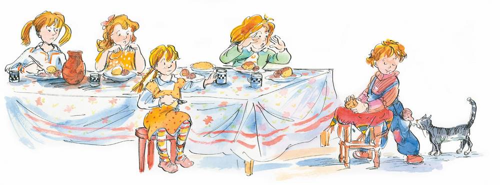 В кухне был накрыт длинный-предлинный стол, так что места хватило всем. Дети сели на скамейку, а Мортен занял место в самом конце стола. Он сел на табуретку, но сейчас же вскочил. Нет, сегодня он не мог нормально сидеть за столом, ведь у него в задних карманах лежали его лучшие друзья! Пришлось Мортену не сидеть, а стоять за столом. Мина находилась ближе всех к нему; дальше, строго по возрасту, сидели все остальные. Таким образом, Марен оказалась от Мортена совсем далеко.