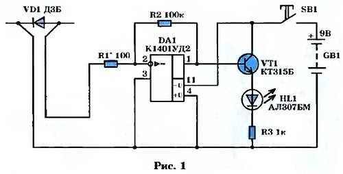 Устройство работает при нажатии на кнопку SB1. Если световой сигнал появляется при расстоянии 5… 10 см от печи, значит, она исправна. Свечение светодиода на значительно большем расстоянии свидетельствует о неисправности печи.