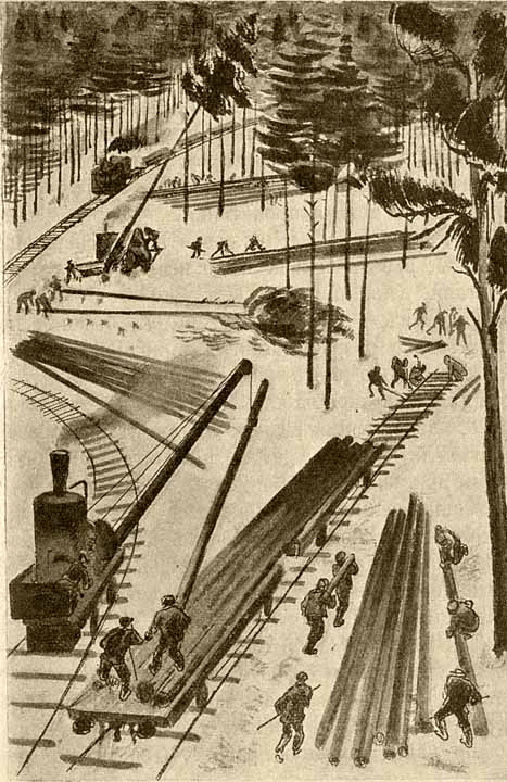 В лесу рабочие жили в домах, построенных на вагонных колесах. Таким образом не приходилось далеко ходить на работу. По мере того как лес уничтожался, прокладывались рельсовые пути, и дома с рабочими катились вперед, все глубже и глубже заползая в лесные дебри. Валились деревья при помощи особых переносных автоматических пил, которые резали деревья как масло. Маленький мотор фыркал и отплевывался, и сосны ложились на бок тихо и послушно. Затем лебедка железными цепями подтаскивала поваленный ствол к полотну, а кран укладывал бревно на платформу. Паровоз отвозил бревна на лесопилку, а потом возвращался за новыми.