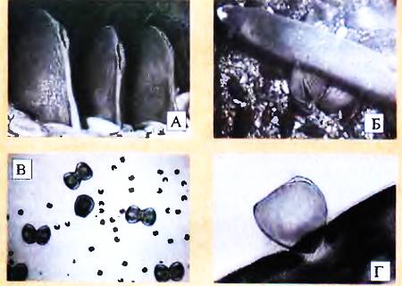 А— колонии жемчужниц; Б— нерест лосося на колонии жемчужниц; В— глохидии в потоке воды; Г— прикрепление глохидии к жабре лосося.