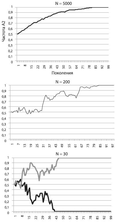 Наконец, на правом графике мы видим, что происходит с точно таким же полезным аллелем в совсем крошечной популяции (N = 30). На рисунке показаны результаты двух запусков модели. В одном случае мутация зафиксировалась, в другом – элиминировалась. Не правда ли, картинка похожа на результат работы дрейфа, а не отбора?