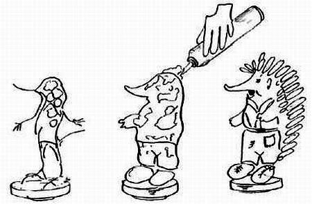 Затем переходим к формовке туловища ежика. В целях экономии пенофлекса каркас стоит предварительно наполнить кусочками поролона или скомканной бумагой. Не стремитесь за один раз четко выдержать выбранный размер фигуры, помня, что на финишном этапе нужно будет закреплять «иголки» ежика из желудей или сосновых шишек. Кроме того, пенофлекс, застывая, резко увеличивается в объеме. Сохнет пена довольно быстро, и чтобы успеть «вмазать» в туловище и голову ежика шишки или желуди, держите их под рукой, подобранных по размеру, отсортированных по качеству и цвету. Крепите шишки на четверть или треть их длины «по шерсти», чтобы ваш зверек не казался взъерошенным.