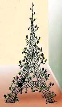 Каркас башни — символа Парижа — лучше соорудить из прутьев лозы, плавника. А телебашню желательно изготовить из набора глиняных, цементных или пластиковых труб различного диаметра, подогнанных друг к другу так, чтоб они с достаточной степенью достоверности соответствовали бы реальному объекту. Прутья можно примотать друг к другу тонкой медной или алюминиевой проволокой, тонким шпагатом, лоскутками стеклоткани на эпоксидном клее.