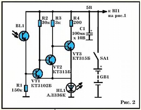 Приемником ИК-излучения служит фототранзистор BL1, извлеченный из неисправной компьютерной мыши. Когда на него попадает ИК-излучение, этот транзистор приоткрывается, вызывая переключение последующих транзисторов VT1…VT3. Отпираясь, последний из них заставляет ярко вспыхивать маячок HL1 в такт импульсов генератора передатчика.