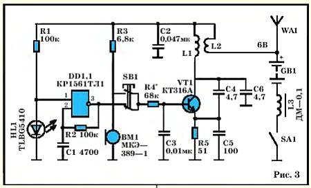 Передатчик может работать в двух режимах — вызова (приглашения к разговору) и речевого обмена. Выбор режима обеспечивается переключателем SB1. На рисунке 3 он изображен в положении вызова, когда на вход генератора радиочастоты подается сигнал низкочастотного генератора, собранного на элементах HL1, R1 и DD1.1, R2, С1.