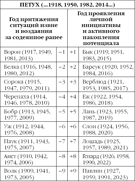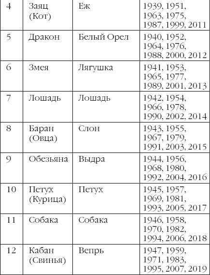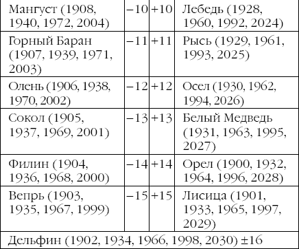Таблица соответствия животных 12-летнему юпитерианскому календарю