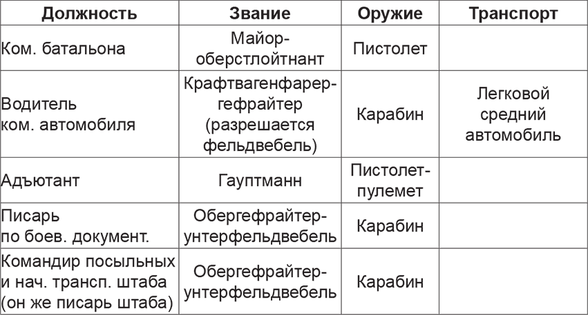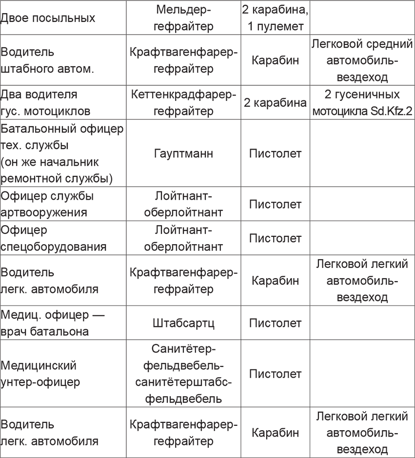 Итак, разберем немецкий тяжелый танковый батальон танков «Тигр». Не будем рассматривать тяжелые танковые роты, поскольку штат роты «тигров» рассмотрен выше. Не будем пока рассматривать и ремонтную роту, поскольку она не представляет большого интереса. Остается рассмотреть только штаб и штабную роту тяжелого танкового батальона. К июню 1944 года штаб и штабная рота формировались по штату K.St.N.1107b (fG) von от 01.06.1944.