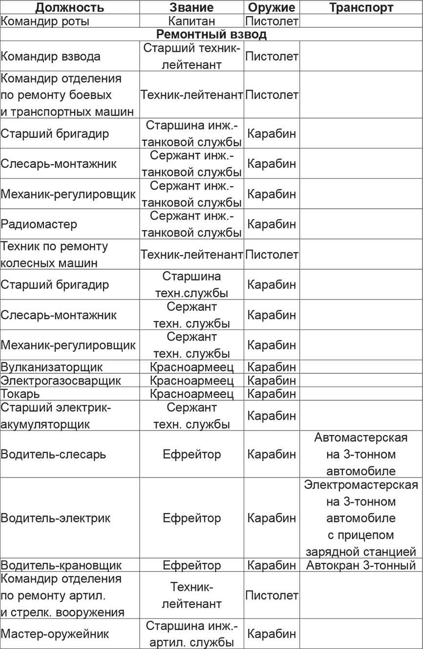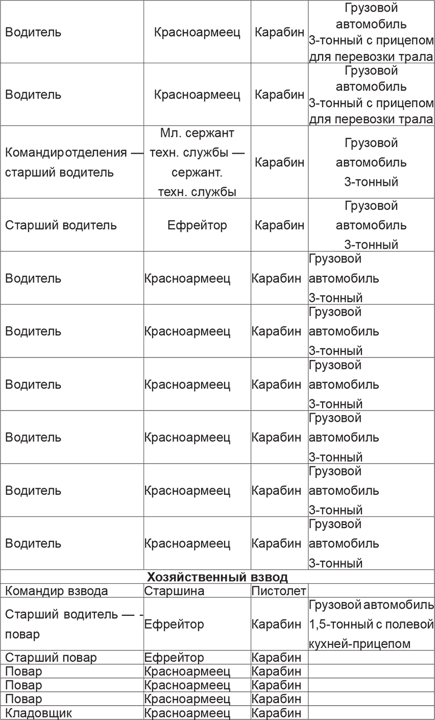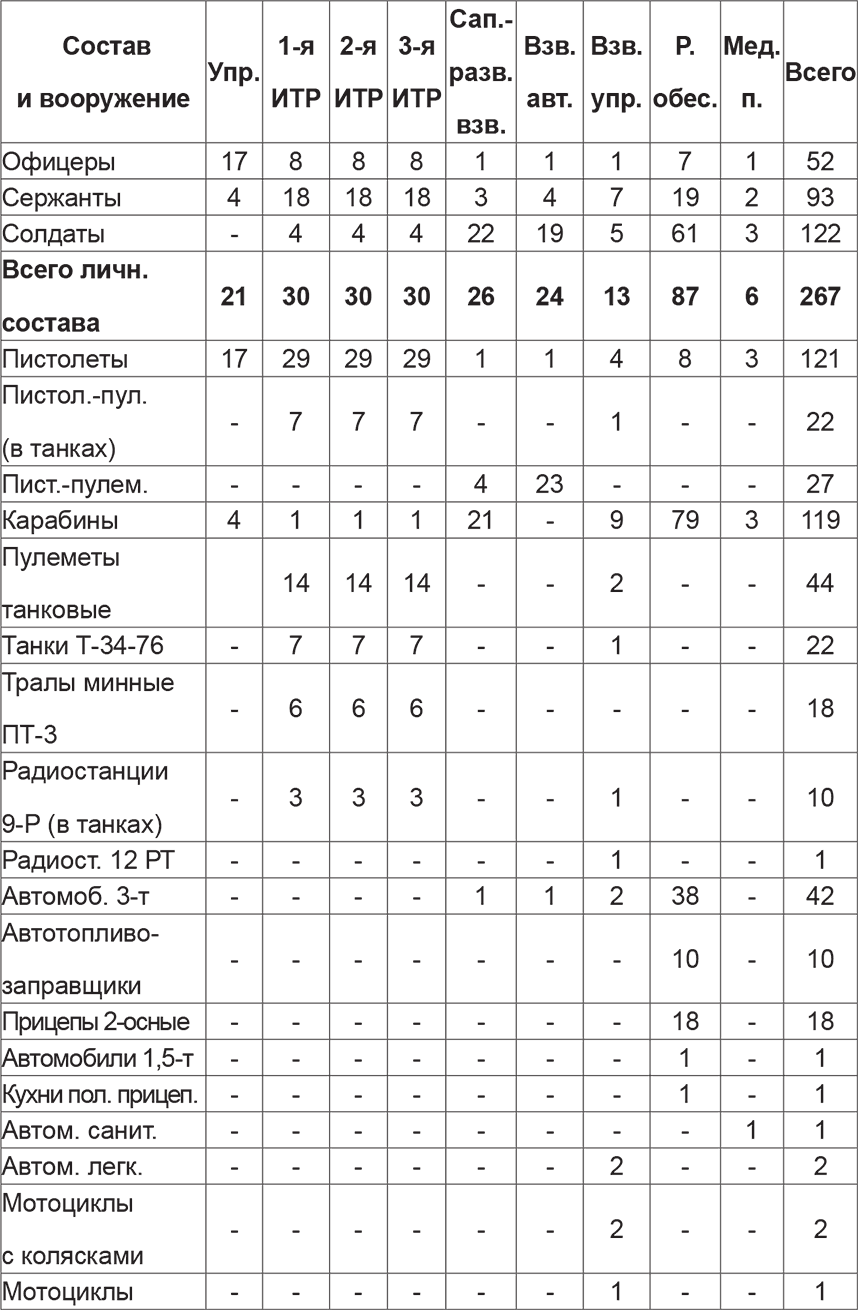 Ну, вот пример – советский танковый полк штата № 010/507. Его штат близок к вышеописанному штату инженерно-танкового полка. Разве что в нем нет тралов, добавлен взвод противотанковых ружей (6 штук). Людей в нем на 111 человек больше. А вот танков всего 21. Обратите внимание на количество танков в полку.