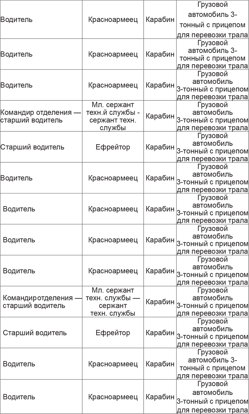 4. Подразделения обеспечения, ремонта и снабжения. К подразделениям относились рота обеспечения и медицинский пункт. Рота обеспечения занималась подвозом боеприпасов, горюче-смазочных материалов, продовольствия и иных грузов материально-технического снабжения, перевозкой минных тралов, ремонтом боевой и транспортной техники, приготовлением и доставкой пищи.