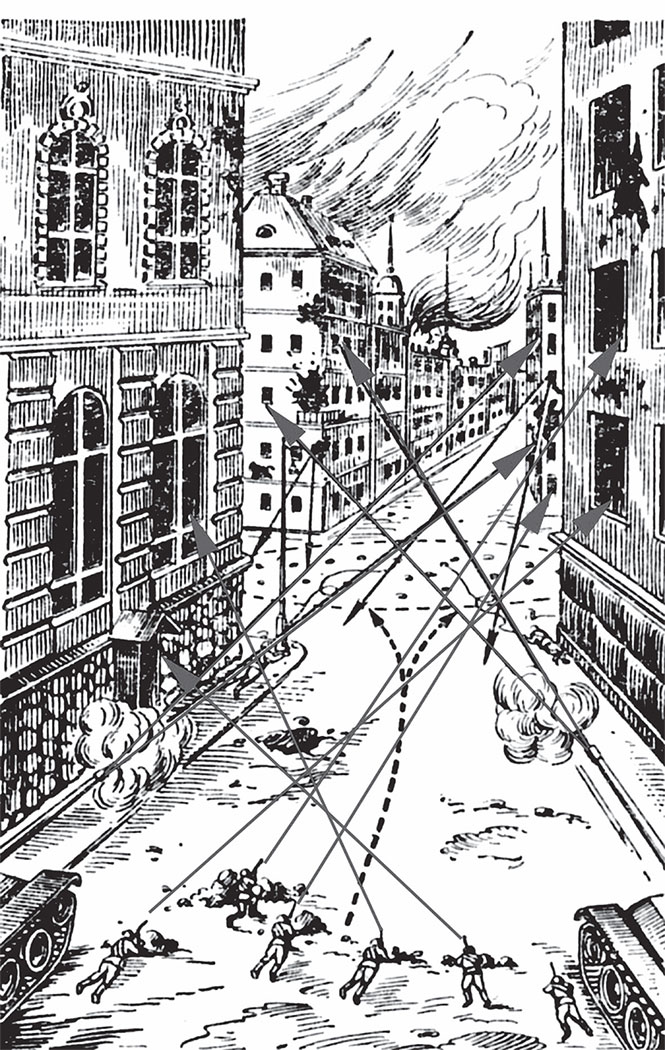 б) на одном уровне с танком по панелям, прижимаясь к стенам домов, идут цепочкой стрелки и автоматчики в готовности открыть огонь по окнам и чердакам домов на противоположной стороне».