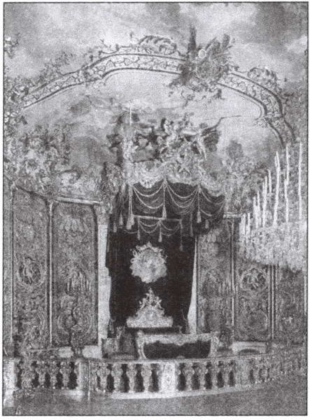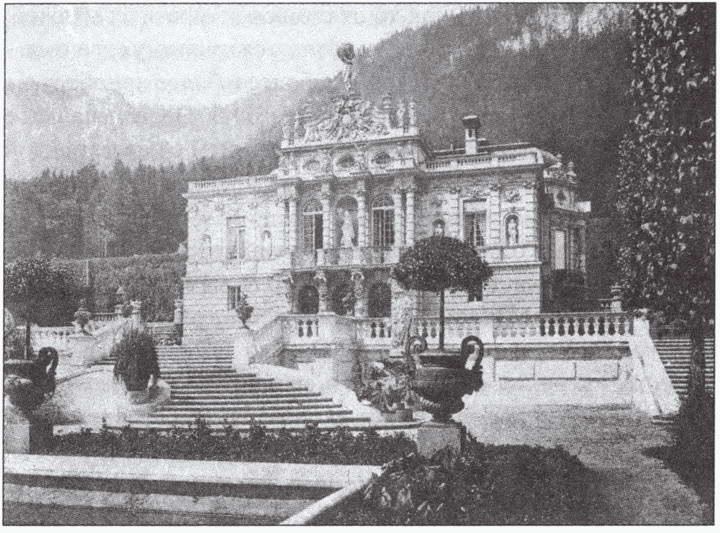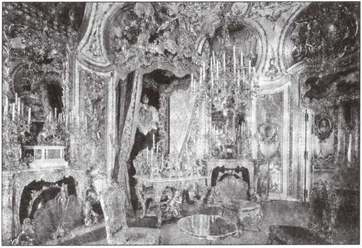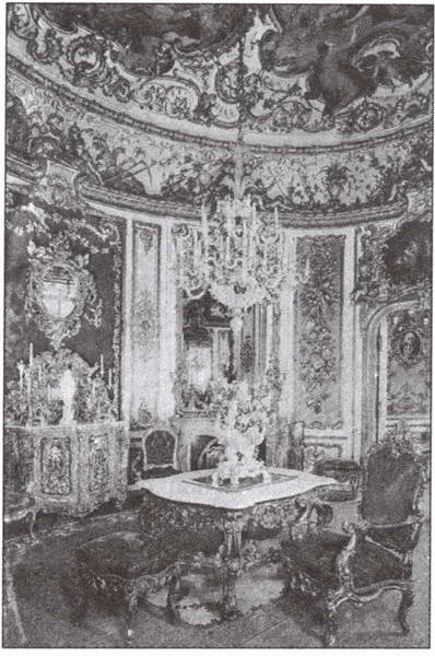 А пока мы входим в маленький уютный Желтый кабинет, выдержанный в желтых, серебряных и серо-голубых тонах, из окон которого открывается великолепный вид на Западный партер парка, и через него проходим в Комнату для аудиенций. Согласно первоначальному проекту уже знакомого нам Кристиана Янка, здесь должен был располагаться Тронный зал. Отсюда и величественное великолепие общего декора помещения. Первое, что бросается в глаза, — золотой рабочий стол короля и богато расшитый золотом зеленый балдахин с горностаевым подкладом, увенчанный золотой короной. На столе — позолоченный письменный прибор. По двум сторонам от стола находятся камины из серого мрамора, на которых стоят конные статуи Людовика XIV и Людовика XV и изящные позолоченные канделябры. Два маленьких круглых малахитовых столика, гармонирующих с зеленым тоном балдахина, — подарок Людвигу II от российской императрицы Марии Александровны, с которой, как мы помним, его связывала самая нежная дружба.