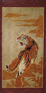 Тигр и его изображения очень популярны в китайском искусстве: его силуэты вырезают из бумаги, вышивают на ткани, его скульптурами украшают комнаты, дома, площади и парки, его образ присутствует на новогодних сувенирах. Одно из самых ранних изображений тигра не только в Китае, но и во всём мире было найдено в древних захоронениях, раскопанных в 1971 году в провинции Хэнань. Оно было изготовлено из мелких речных раковин и представляло собой две фигурки зооморфных существ, напоминающих тигра и дракона. Считается, что племена западных районов, граничащих с Монголией, поклонялись тигру, в то время как восточнокитайские народности обожествляли дракона. Впоследствии дракон очень сильно потеснил тигра в китайском пантеоне. Культурологи полагают, что это произошло тогда, когда основным видом хозяйствования на всей территории Поднебесной стало оседлое земледелие. Как тотем, «отвечающий» за погоду, дракон был важнее для крестьянина, нежели тигр, который в большей степени «влиял» на жизнь охотников и скотоводов-кочевников.