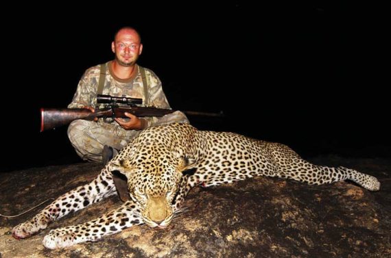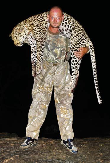 «Профессиональный охотник светит мощным фонарём, определяет пол зверя и даёт команду стрелять/не стрелять. Всё длится менее двух секунд. Тут в самый раз о калибре — если сделать подранка, ночью его никто добирать не отважится (леопард в одном прыжке может искалечить три-четыре человека, он не убивает, а именно калечит, когда ранен). Поэтому очень важно, чтобы зверь лёг там, где ты его стрельнул. Леопард стреляется, как правило, на ветке дерева и валится вниз. Так вот подход к месту, куда он упал, выглядит, как операция спецназа в дешёвом боевике. Профессиональный охотник берёт двустволку с картечью, главный следопыт — карабин профессионального охотника, гейм-скаут — свою надёжно замотанную изолентой бердану, охотник снимает прицел и молится… Второй следопыт светит фарой и бормочет заклинания на своём суахили… Подходят к месту полукольцом (есть шанс, что подранок выскочит в свободное пространство)».