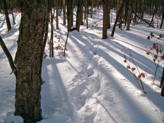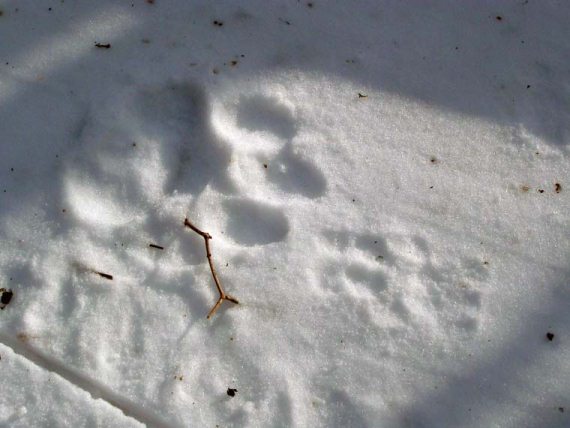 Идя по снегу, понимаю, что хищнику так же несладко, как и копытным. Пройдя несколько метров по насту, он проваливается в снег и дальше идёт уже как ледокол. На снегу видны даже следы усов от торчащей из-под снега морды зверя. Замер следа показывает шесть сантиметров и два миллиметра; дальше цепочка следов выходит на крутой южный склон со скальной грядой, тянущейся километра три на юго-запад.