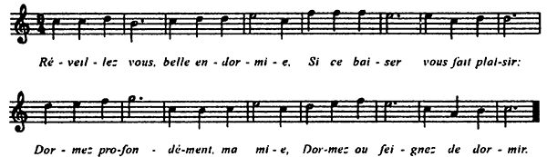 R'eveillez-vous, belle endormie, R'eveillez-vous, car il est jour; Mettez la t^ete `a la fen^etre: Vous entendrez parler de vous! <Проснитесь, прелестная сонливица, Проснитесь, ведь день уж наступил; Взгляните из окон: Вы услышите, что о вас говорят!>В Россию, однако, попало более отшлифованное изделие. Слова в нем словно тронуты пуховкой жеманного сластолюбия, столь типичного для эпохи Дюфрени, но мелодия отличается изяществом и к 1820 г. давно стала любимым произведением издателей песен для детей и молодых девиц. К тому времени строки оригинала (слабый отголосок которых слышится в письме Татьяны, например, в строках 39 и 62) были забыты и заменены в различных носящих характер поздравления аранжировках более скромными: