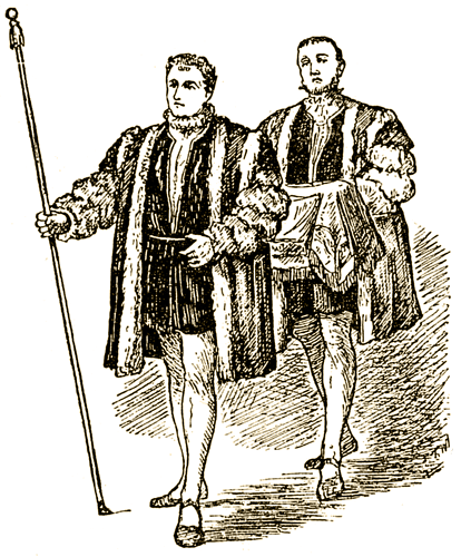 Поспешим же — благо нам дано это право — в большой обеденный зал и посмотрим, что там происходит в то время, как Том готовится к великим торжествам. Это — обширный покой с золочеными колоннами и пилястрами, с расписными стенами, с расписным потолком. У дверей стоят рослые часовые, неподвижные, как статуи, в роскошных и живописных костюмах. В руках у них алебарды. На высоких хорах, идущих вокруг всего зала, помещается оркестр; хоры битком набиты богато одетыми гражданами обоего пола. Посредине комнаты, на возвышенном месте, стол Тома. Но предоставим слово старинному летописцу: