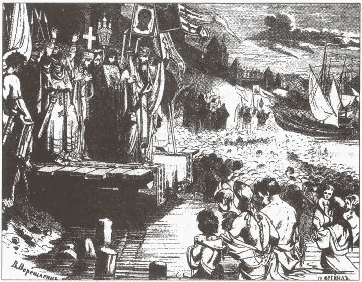 Итак, киевское вече, пошумев, одобрило призыв князя и городской знати всем миром поменять веру. На следующий день [70] поутру, на берегу реки (то ли Почайны, как сказано в татищевском источнике и в Житии Владимира особого состава, то ли Днепра, по известию Повести временных лет и Обычного жития Владимира) сошлось множество людей обоего пола и всех возрастов. Священники разделили их на группы и велели по очереди заходить в реку, которая заменила собою купель. Чтобы вся толпа могла разместиться на мелководье, первым рядам приходилось заходить в воду по шею, следующие за ними стояли в воде по грудь, а тем, кто оказывался ближе всего к берегу, вода доходила до колена. Священники читали положенные молитвы, а потом давали каждой купе крестившихся христианские имена: одно мужское — общее для всех мужчин, другое женское — всем женщинам (никакого бытового неудобства от этого не возникало, так как и после крещения в повседневном обиходе все равно использовались только светские, «языческие» имена). Пробовали сосчитать новообращенных, да сбились со счету {83} .