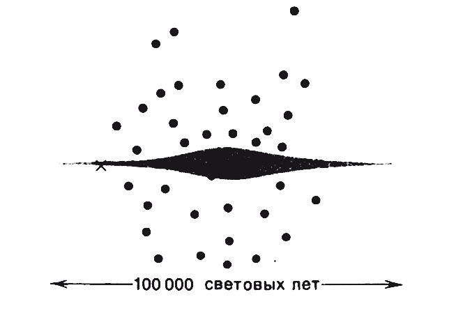 Рис. 12. Галактика в поперечном разрезе (а) и в плане (б). Большая часть материи сосредоточена в спиральных рукавах и в центре. Вокруг них рассредоточены небольшие шарообразные звездные скопления, которые обозначены черными кружками. Приблизительное положение Солнца в Галактике показано крестиком