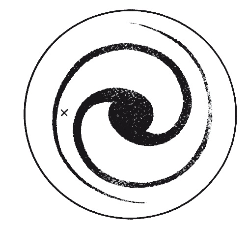 Возможно, поворот земной оси относительно плоскости эклиптики не является прецессией земной оси, а связан с дополнительными поворотами плоскости эклиптики, которые возникают по следующей причине. Наша галактика спиралевидна, имеет «рукава». На рис. 12 показана ее упрощенная модель: вид сбоку (а) и в плане (б) [71, 63]. Крестиком отмечено приблизительное местоположение Солнечной системы. Можно ожидать, что Солнечная система наряду с обращением вокруг центра галактики обращается также вокруг ближайшего рукава с периодом 25 920 лет.