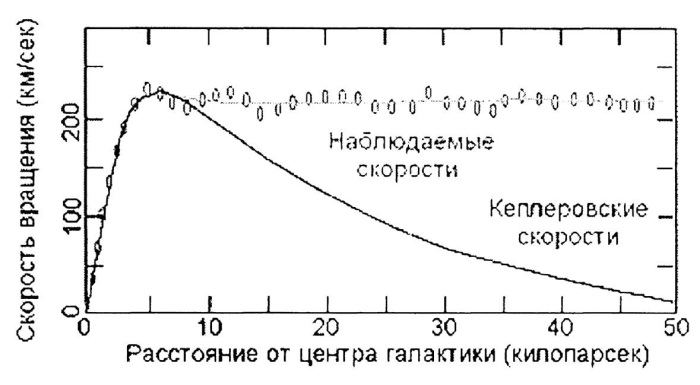 Смещением центра притяжения периферийных звезд в направлении утолщения рукавов можно объяснить и то, что периферийные звезды имеют орбитальные скорости, которые превышают рассчитанные по закону Кеплера относительно центров спиралевидных галактик. В центральной же части галактики, где рукавов нет, орбитальные скорости звезд, как видно из графика, соответствуют расчетным (рис. 13).