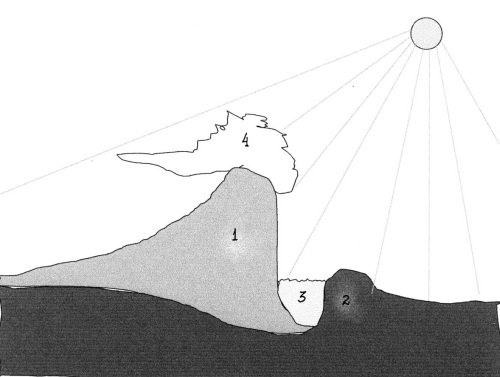 Рис. 4. Мировая гора и река Океан в разрезе север — юг: 1 — ледник: 2 — морена напора; 3 — река Океан; 4 — облака