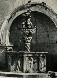 Правее ворот, у большой ниши в стене здания находится Малый фонтан Онофрио де ла Кава, о котором мы уже упоминали. Он имеет сложное скульптурное обрамление. Невысокий восьмигранный парапет бассейна украшен горельефными фигурками обнаженных мальчишек несколько удлиненных пропорций. Из центра бассейна поднимается витая колонка со скульптурными изображениями тритонов, она завершается чашей-раковиной, декорированной растительным орнаментом и масками, изо рта которых льется вода. В середине раковины помещена еще пирамидка, украшенная фигурами маленьких дельфинов. Весь этот декор по проекту де ла Кава исполнил скульптор Петр Мартинов (иначе именуемый Пьетро ди Мартино).