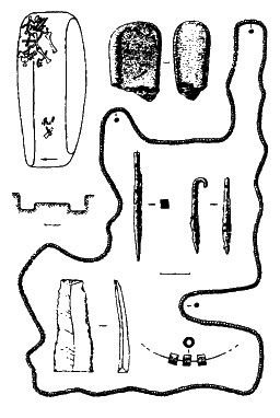 Сейчас трудно сказать, какие вещи еще были положены в это погребение. Его ограбление в древности косвенно свидетельствует о том, что здесь были ценности, представлявшие несомненный интерес для современников. О том, что в яме находилось немало металла, свидетельствует и окрашенность некоторых ребер и лучевых костей в характерный зеленоватый цвет, оставляемый медью. Не исключено, что здесь также находились бронзовые браслеты и украшения, унесенные древними любителями наживы. В пользу этого указывают находки медной бусины и медной пронизки, входивших, скорее всего, в состав ожерелья из металла. По количеству и богатству инвентаря данный комплекс не может соперничать с джурджулештским могильником. Но характерный состав сохранившихся находок, безусловно, свидетельствует о том, что эти памятники были оставлены одним народом еще в докурганную эпоху. Кем же?